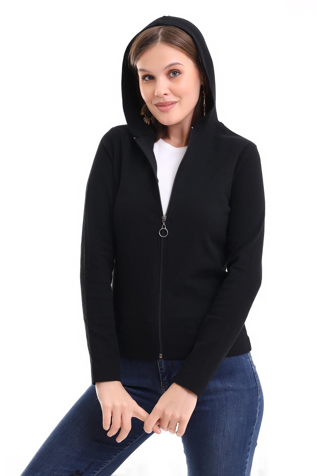 SENNAR Kadın Uzun Kollu Fermuarlı Kapşonlu Basic Örme Hırka
